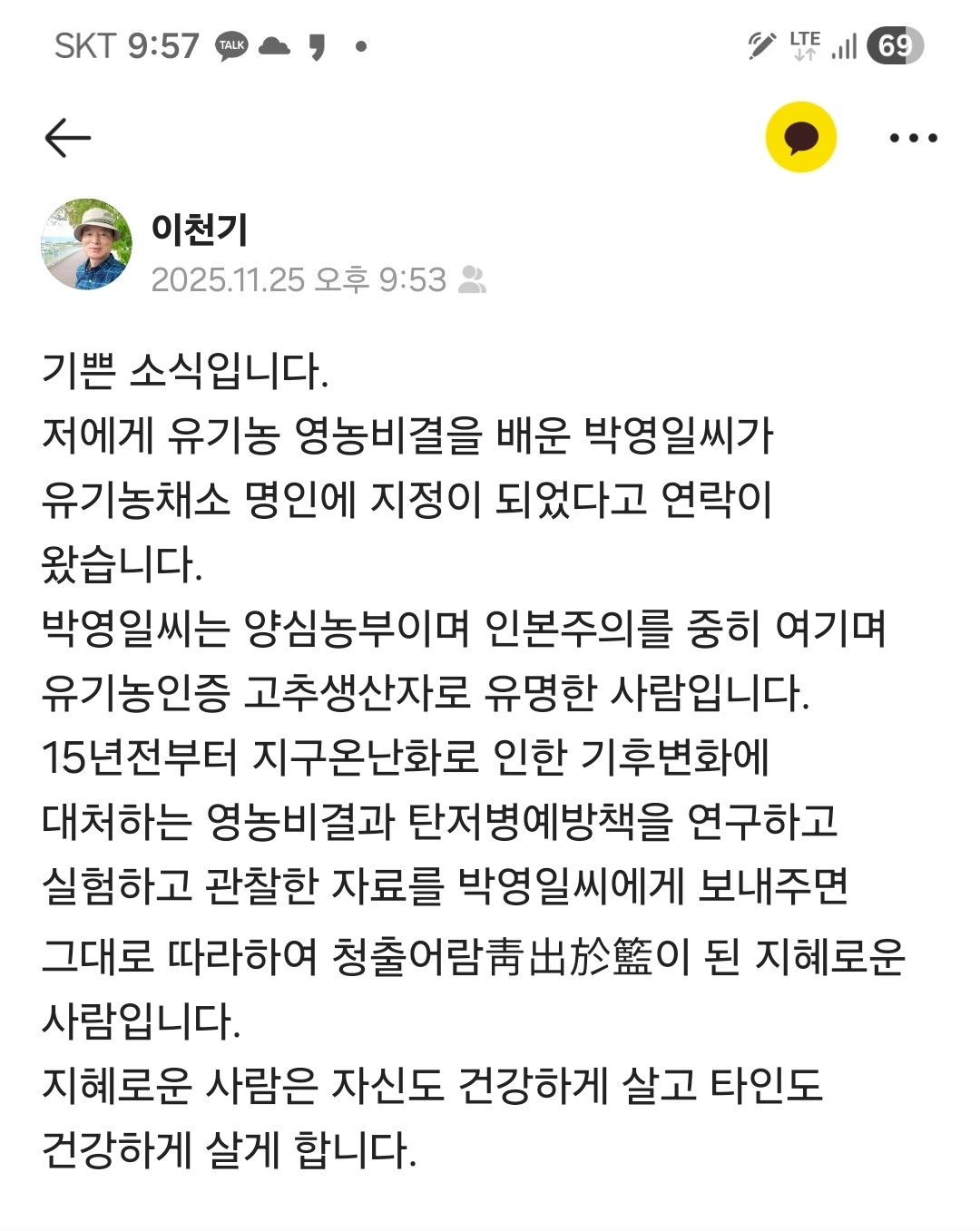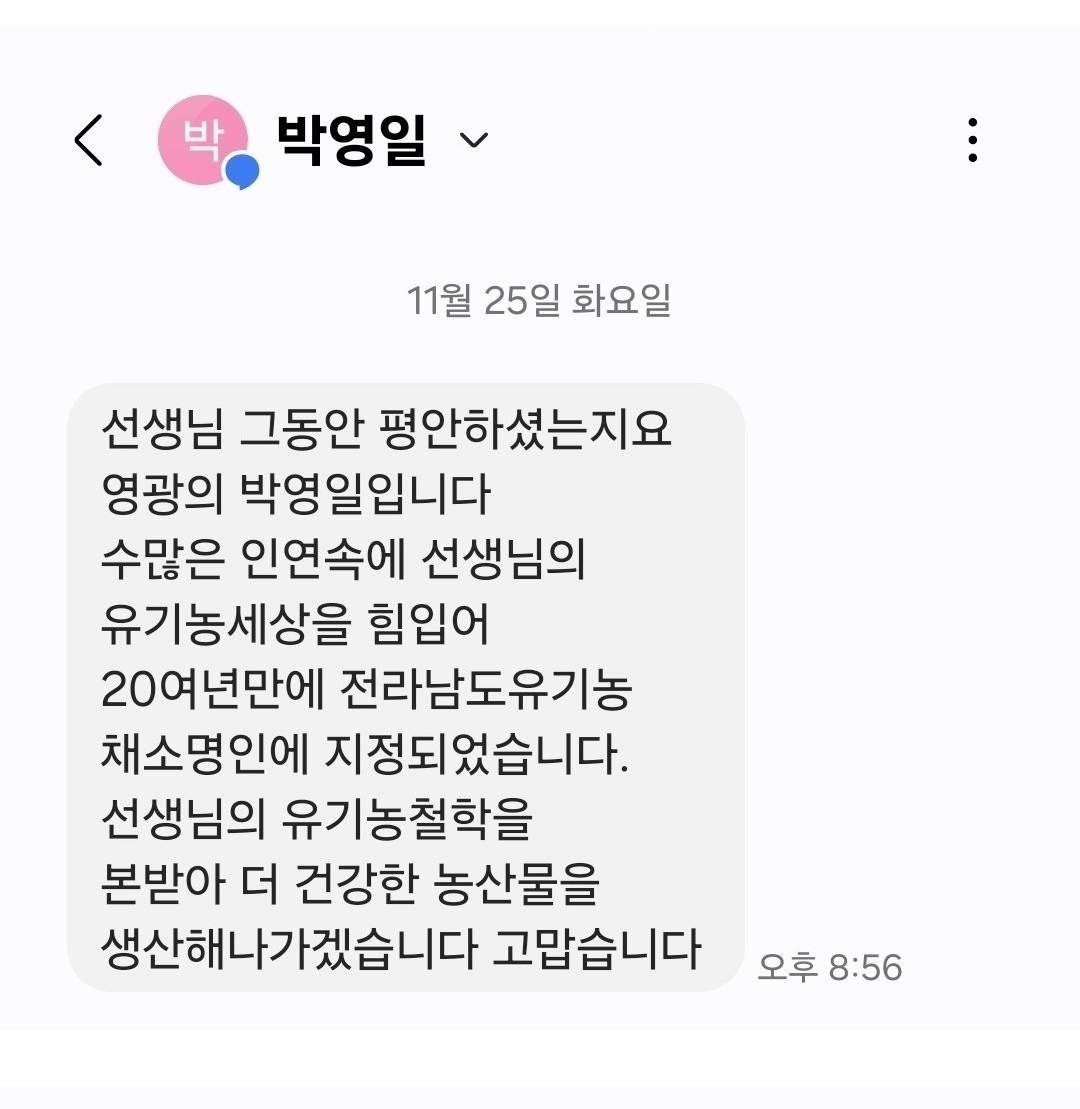 저에게 유기농 영농법을 배운 농부님이 유기농 명인이 되었습니다.